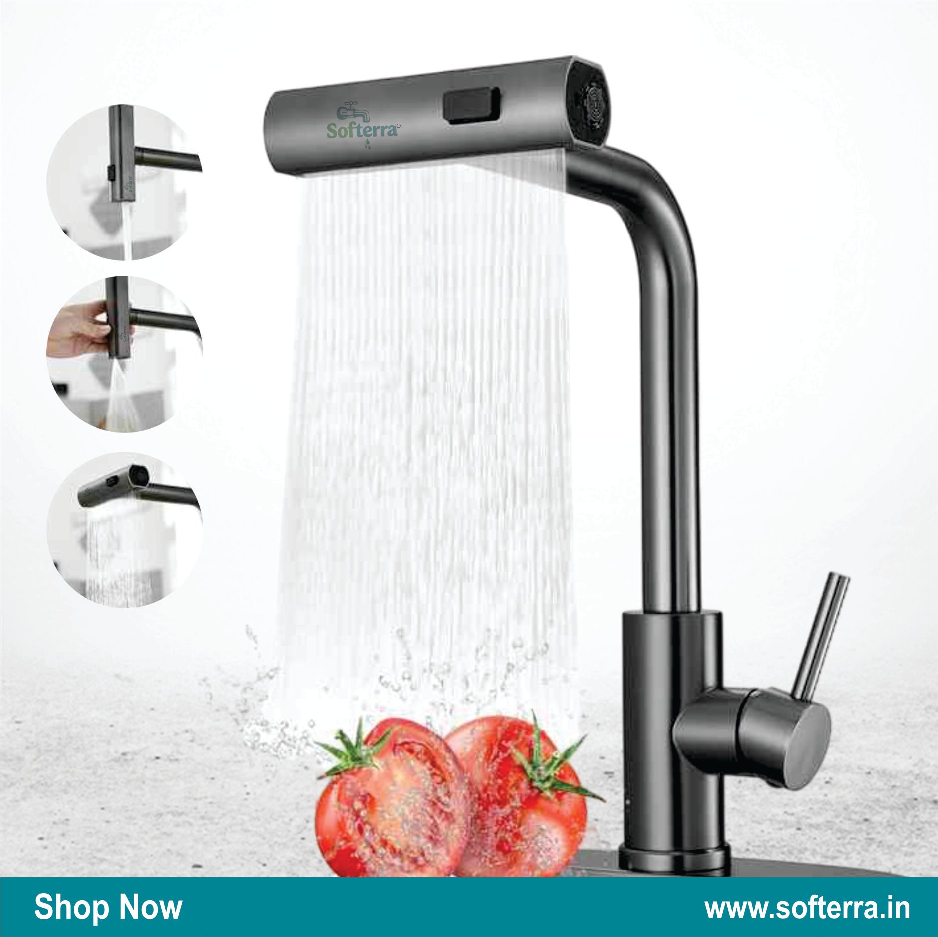 Softerra FlexiFlow™ is a smart 360° rotating tap extender with dual spray modes (Mist + Jet). Its flexible 6-inch gooseneck reaches every corner of your sink while saving up to 80% water with EcoSmart aeration. Perfect for kitchens & bathrooms.